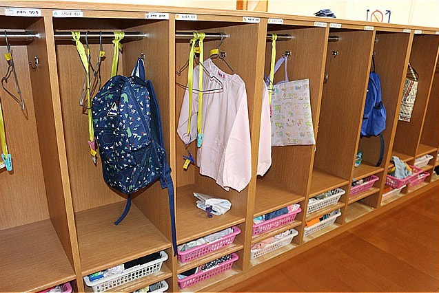 3歳以上児になると、「自分の事は自分で・・・」クロークに荷物や着替えを入れます。整理整頓も自分で出来るようになります。